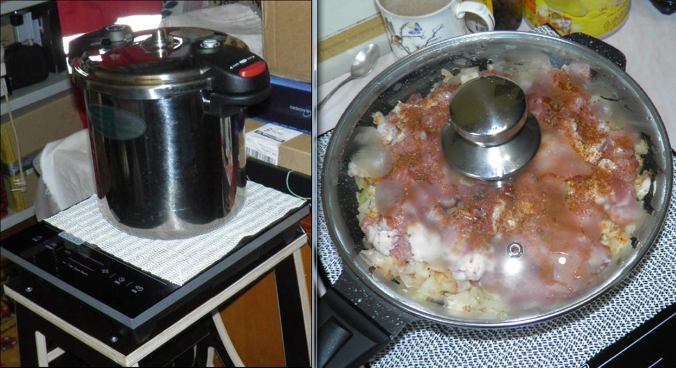 На весь процесс приготовления (вместе с кипячением воды в чайнике и тушением в сковороде..) было потрачено 2.1квт-ч в сети 220в. или 87.5а-ч в сети 24в. Пока в скороварке варилось мясо, я нарезал сало, лук, корнеплоды, квашености и зелень. Затем скороварка с мясом остывала, а сковорода была на плите и занималась тушением-жаркой всей необходимой растительности. Выяснилось, что мощность надо 700-1000вт. - иначе слишком долго выпаривается вода. Через час я получил вкусный результат и затраты на сковородку - 0.9квт-ч. В целом впечатление от индукционной плитки очень хорошее, а потом я ее разобрал и увидел - надо сетевой ввод сделать через компутерные вилка-розетка, это будет удобно..