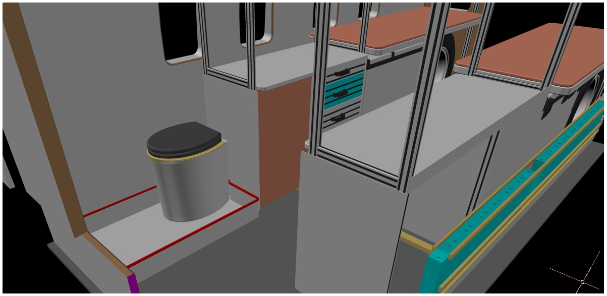 - кухонный стол по правому борту имеет разделочную площадь с мойкой (1100х550мм.) и посудный шкапчик-комод на 5 ящиков (600х520х850мм.) с минимальным походным набором посуды, специй и круп. Стол примыкает к сантехподдону со стиралкой "Koh-i-noor", биотуалетом и емкостью с теплой водой. Микроволновка стоит на рабочем столе напротив кухонного или висит промеж стоек. Сливное отверстие сантехподдона затыкается рогатой пробкой, в которую включены отсос газов биотуалета, слив мойки и слив стиралки. Ширма-занавеска позволит принимать душ и восседать на горшке.. Как буду хранить печку и "МоржМакс"- под рабочим столом? Вполне возможно.. Пока что они любят кататься в Джимнике;